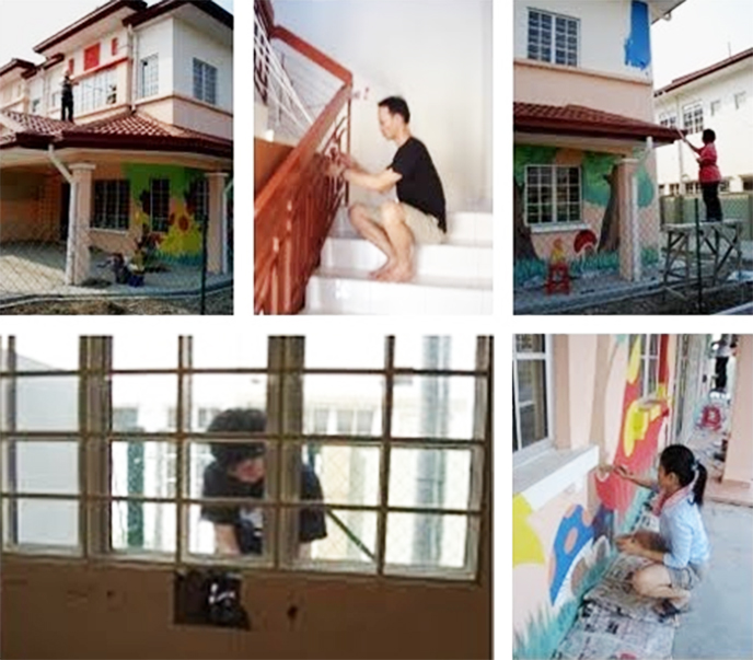 三位创办人偶而都会戏称这幼教中心是三个臭皮匠努力拼凑的成果,实际上我们更想说的是在幕后有许多诸葛亮在帮助我们,我们身边亲近的人、亲戚、朋友、远在台湾的同学老师等都给予我们很多的支持与鼓励;从上述一些照片中,可以看到他们对我们的支援,包含远从台湾到来的辅导专业老师帮我们绑安全绳(只 因他说当过军队里的工兵),还有邓院长的父母不是爬上屋顶瓦上油漆就是爬上五六尺高木架,头戴草帽,手持十尺长尾段绑漆扫的长杆漆上好几小时,这一幕亦让我印象深刻,在那几个星期里,我们的家人朋友都成了油漆工、水喉工、除草工人等。 |