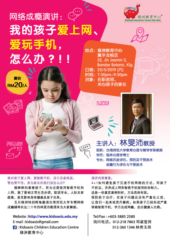 基于此,特地跨海邀请拥有智能机和网络沉迷预防与治療研究和实务工作及讲学等经验二十年、台湾师范大学教育心理与辅导学系林旻沛教授,来为家长、一般教师与心理老师传授实际且有效的预防和治療方式,并提供有效的解决办法。